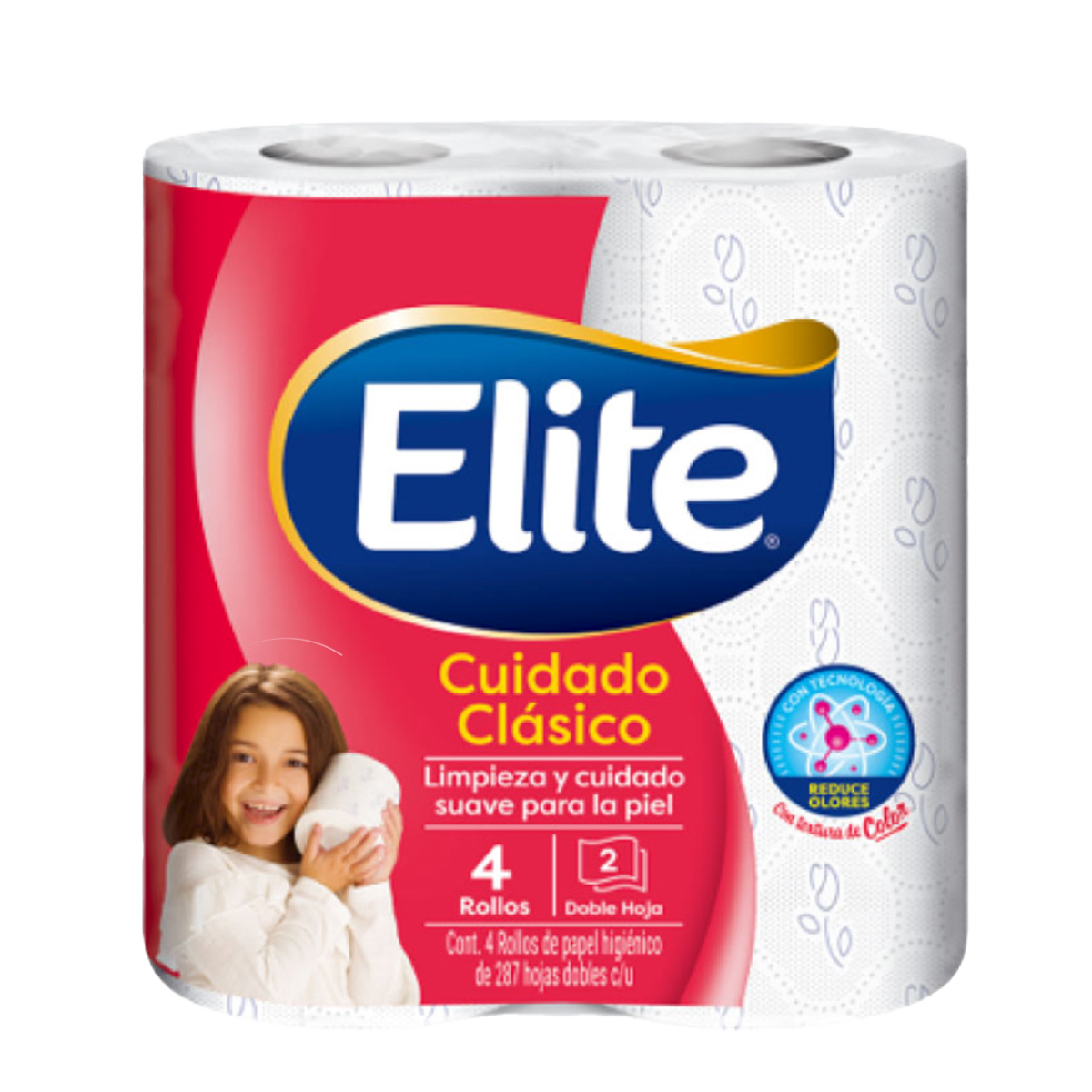 Elite Cuidado Clásico 4 Rollos 287 Hojas dobles Papel Higiénico con tecnología que reduce malos olores. Textura con color para brindar una limpieza y cuidado en todas sus hojas. Encuentra la misma calidad en todas sus presentaciones.